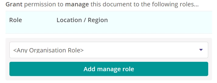 - If you wish to limit who has access to manage the document, select the Roles you wish to grant access to from the drop down. In the example below, any roles that have an Organisation wide scope will be able to manage the documents.