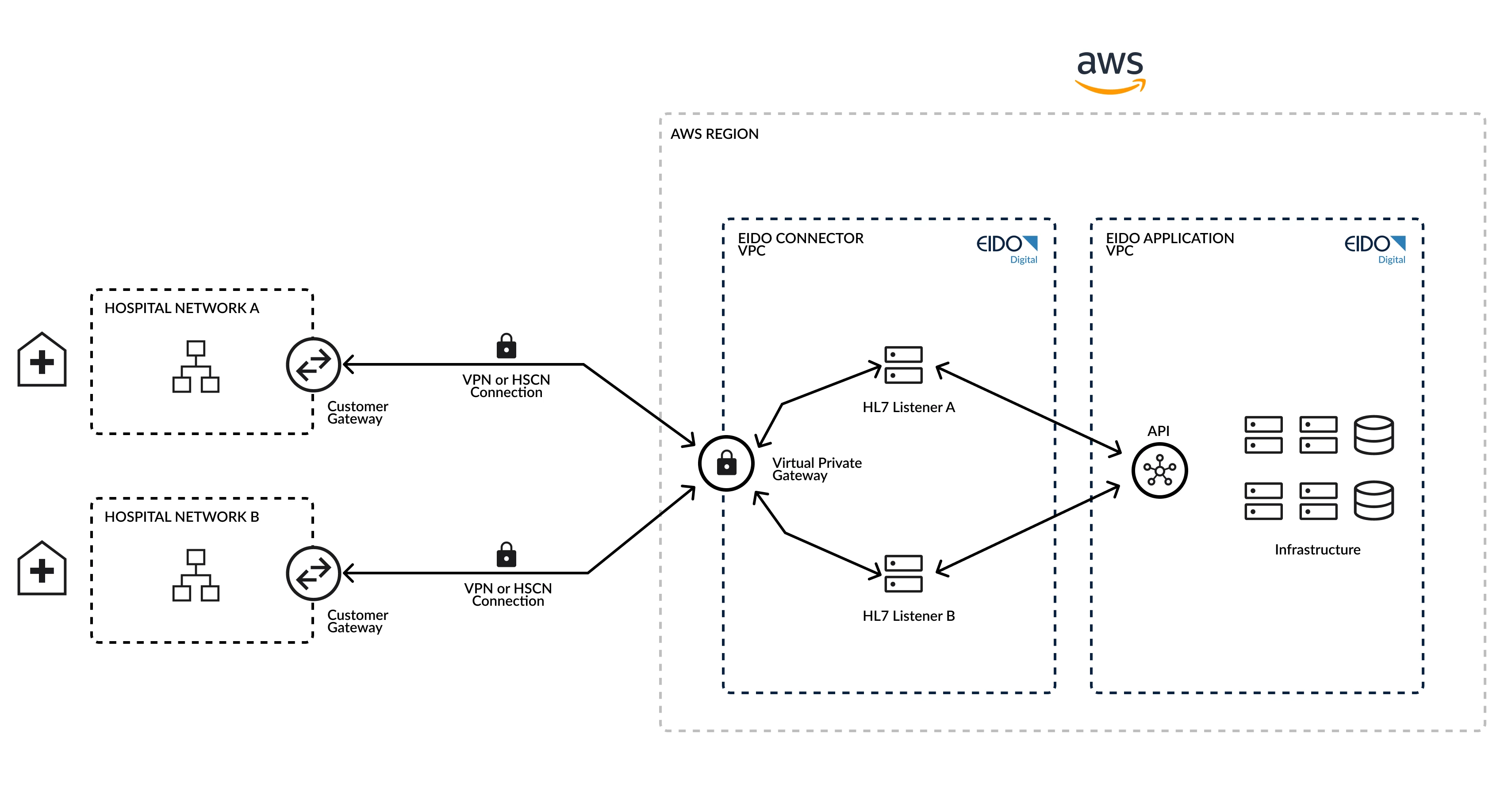 The HL7 Bridge enables a secure connection between your hospital network and the EIDO cloud platform, hosted on AWS. It allows HL7 messages containing patient demographic data to be sent from your EPR to EIDO, where they are parsed and added to your organisation’s account.